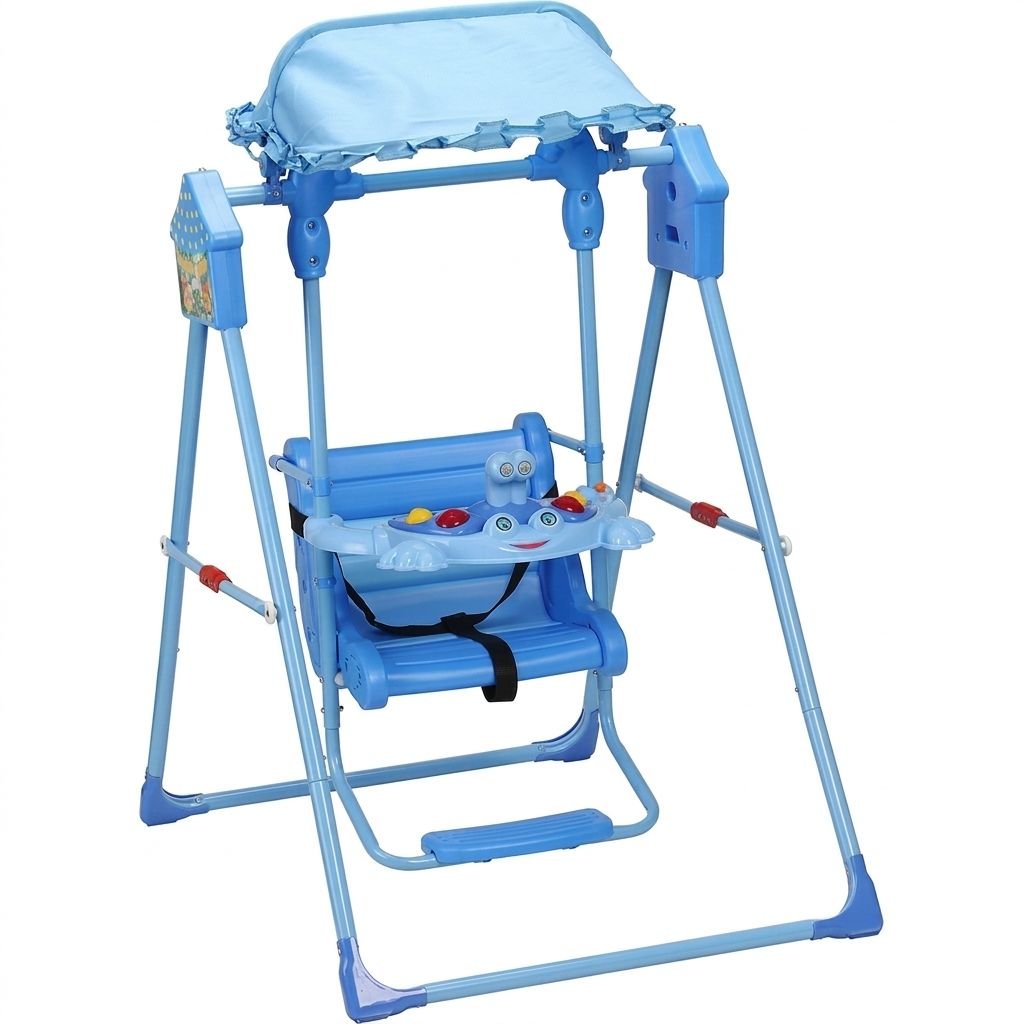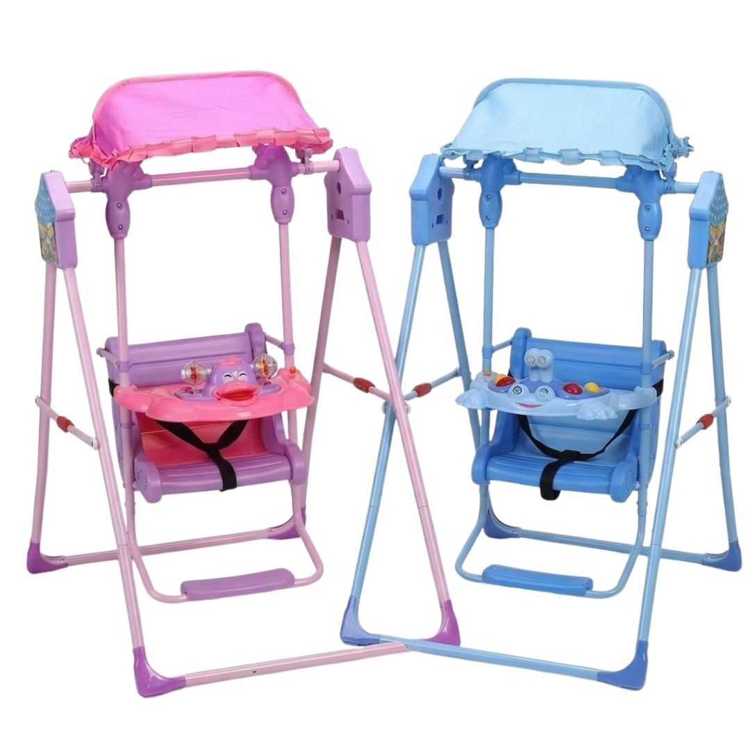 The swing features a built-in musical toy tray with friendly characters and flashing lights to keep your baby entertained. For added comfort, the adjustable fabric canopy protects your child from overhead lights or sun glare. Safety is a priority, which is why each swing is equipped with a secure lap belt and a sturdy, wide-base metal frame to prevent tipping. When not in use, the frame can be partially folded for convenient storage.